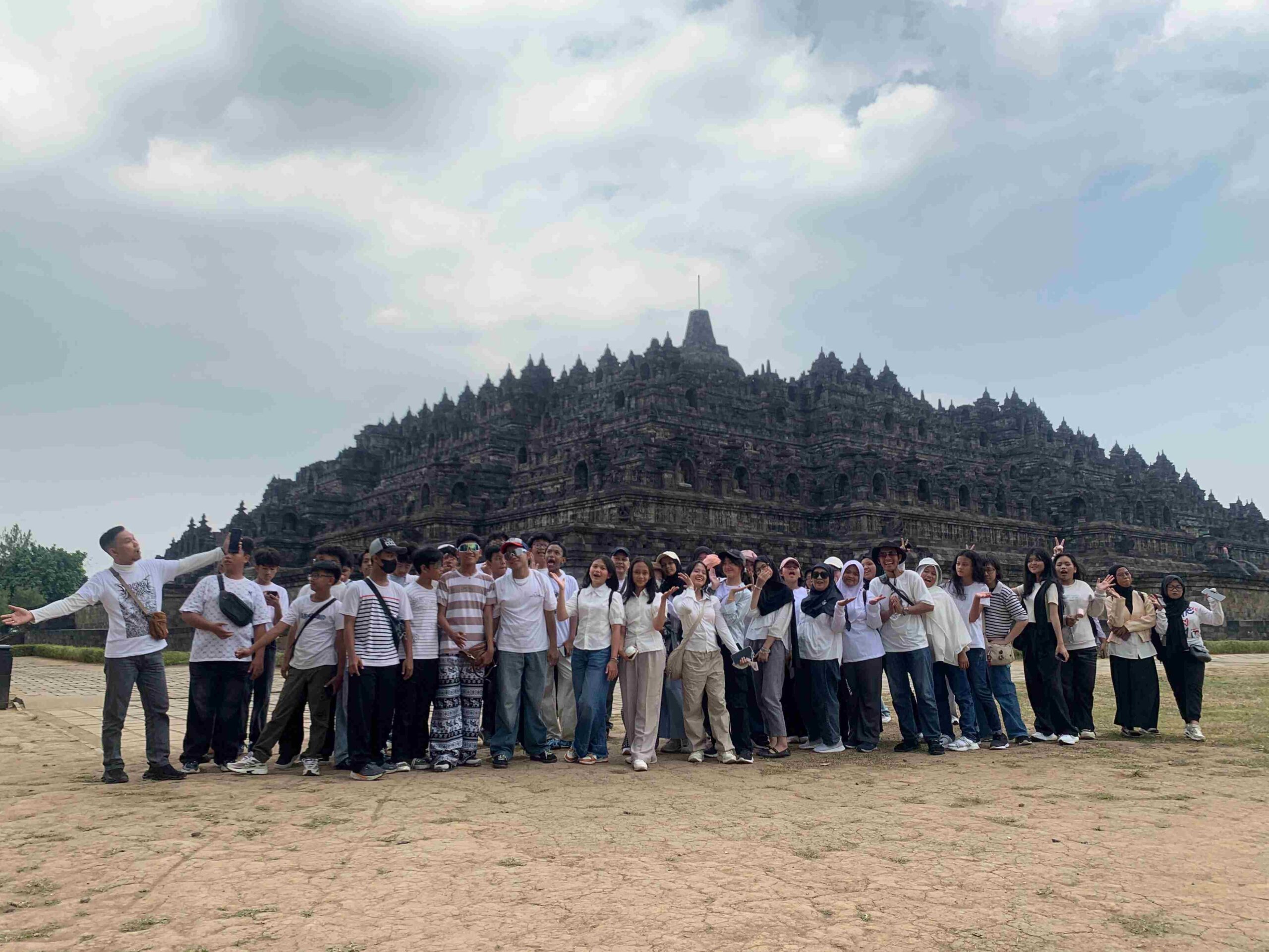 Setelah puas dengan kegiatan memetik salak, rombongan melanjutkan perjalanan menuju Candi Borobudur. Panas matahari siang tidak menyurutkan semangat kami untuk naik ke atas candi. Tangga demi tangga kami lalui sambil menikmati relief yang penuh cerita sejarah. Dari puncak candi, pemandangan alam yang luas membuat lelah seakan hilang. Kami pun tak lupa mengabadikan momen dengan berfoto bersama.